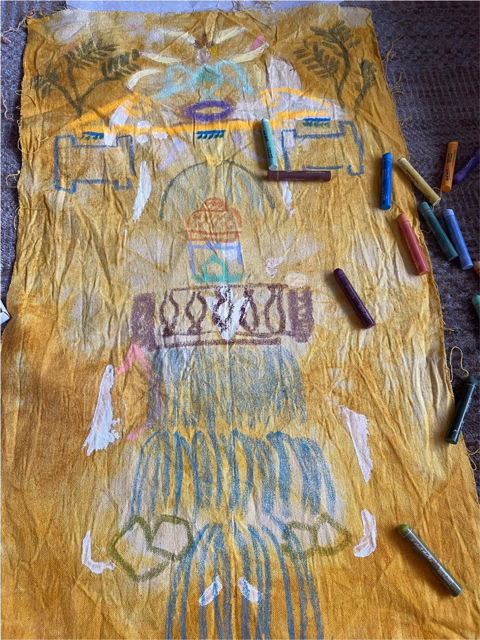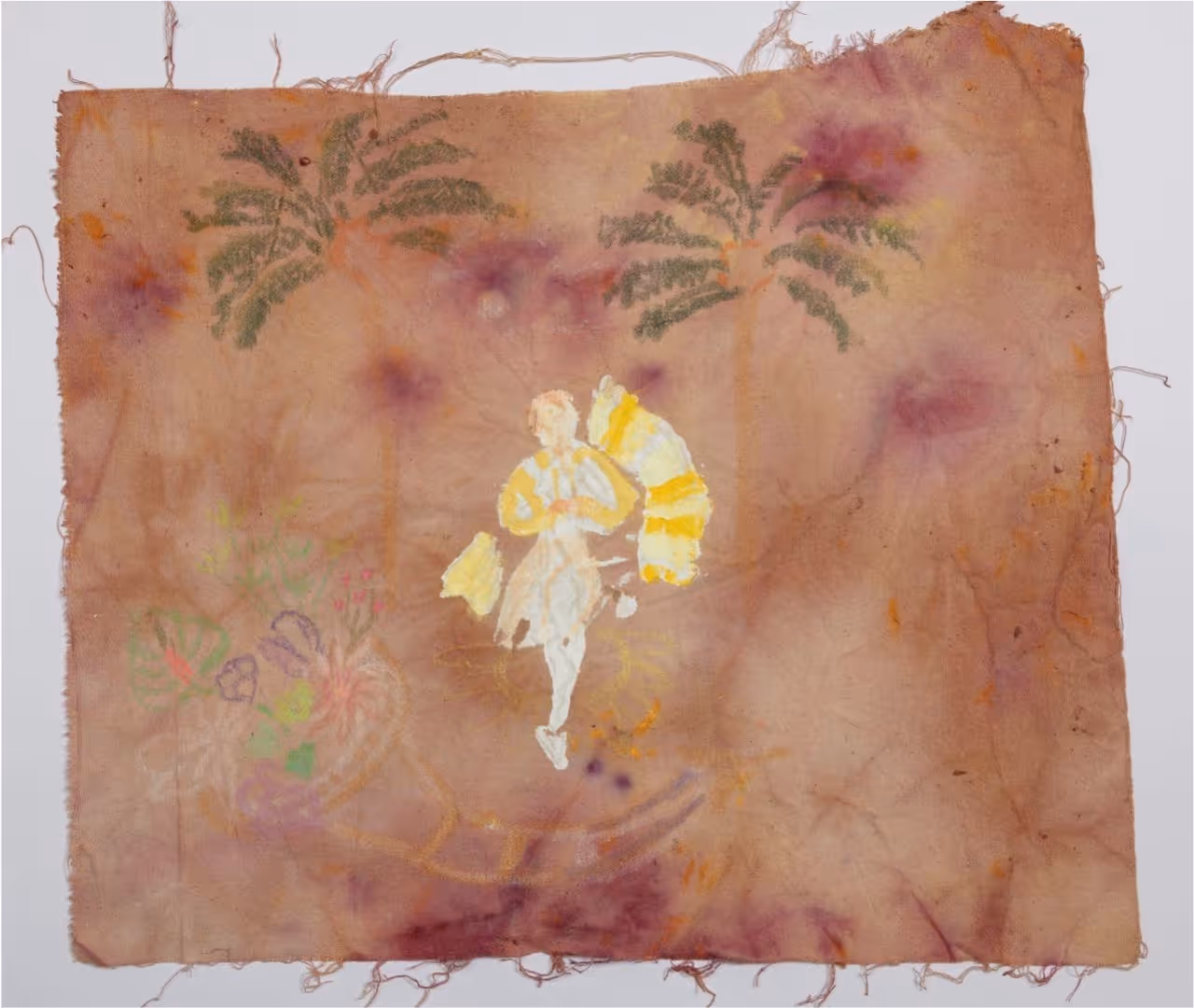 In this series, Leena dyes canvases with sumac and other herbs like saffron, turmeric, and cinnamon. The drawings come from pieces of land and romantic gardens that Teta has described to Leena in their time spent together and other things that Teta loves.